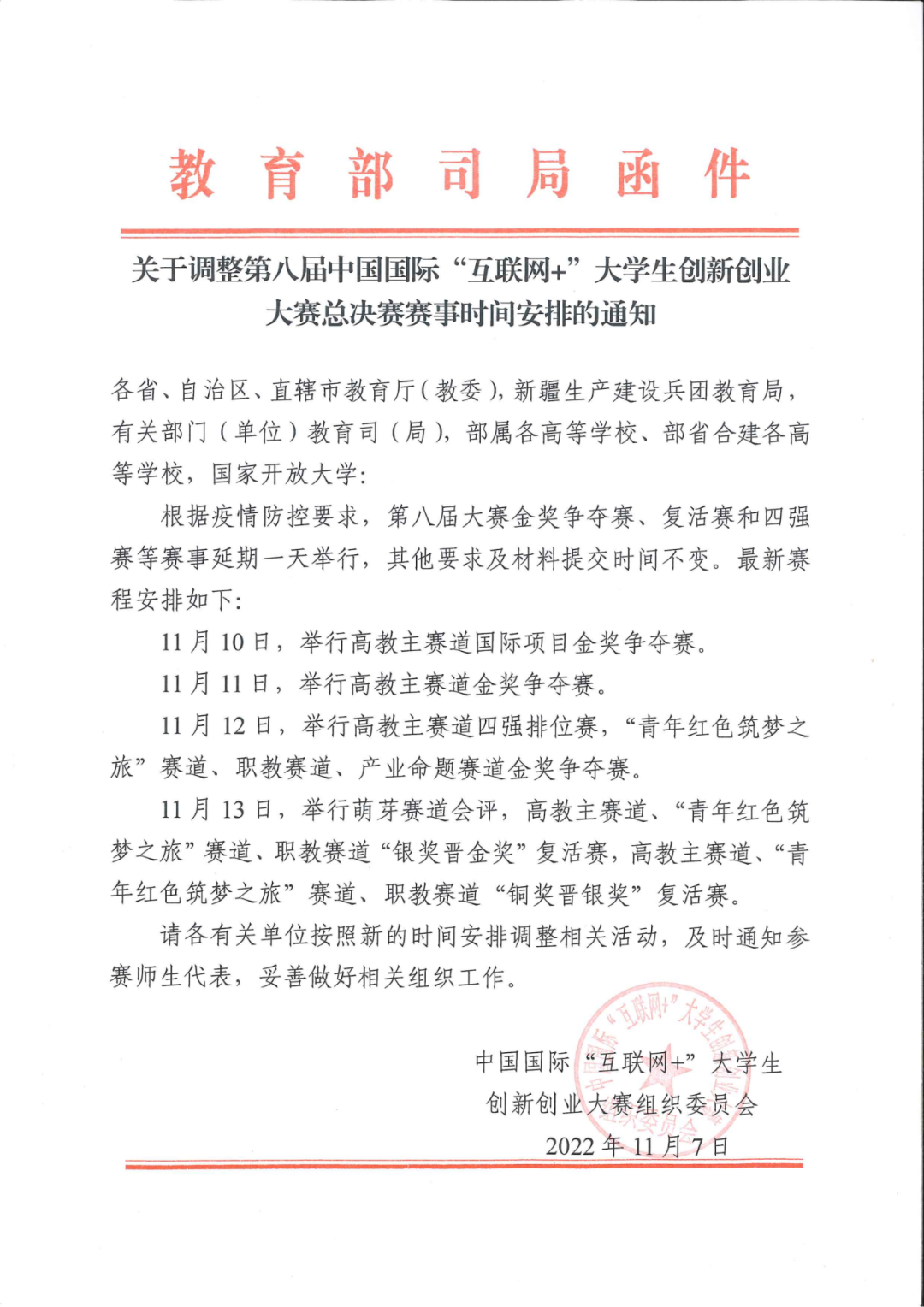 关于调整第八届中国国际“互联网 ”大学生创新创业大赛总决赛赛事时间安排的通知